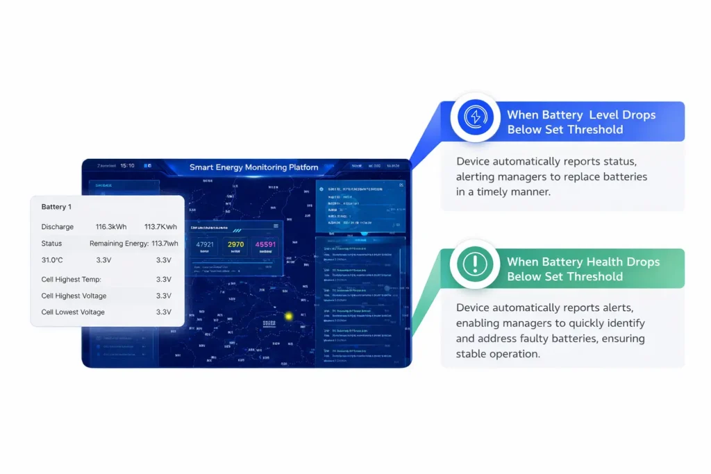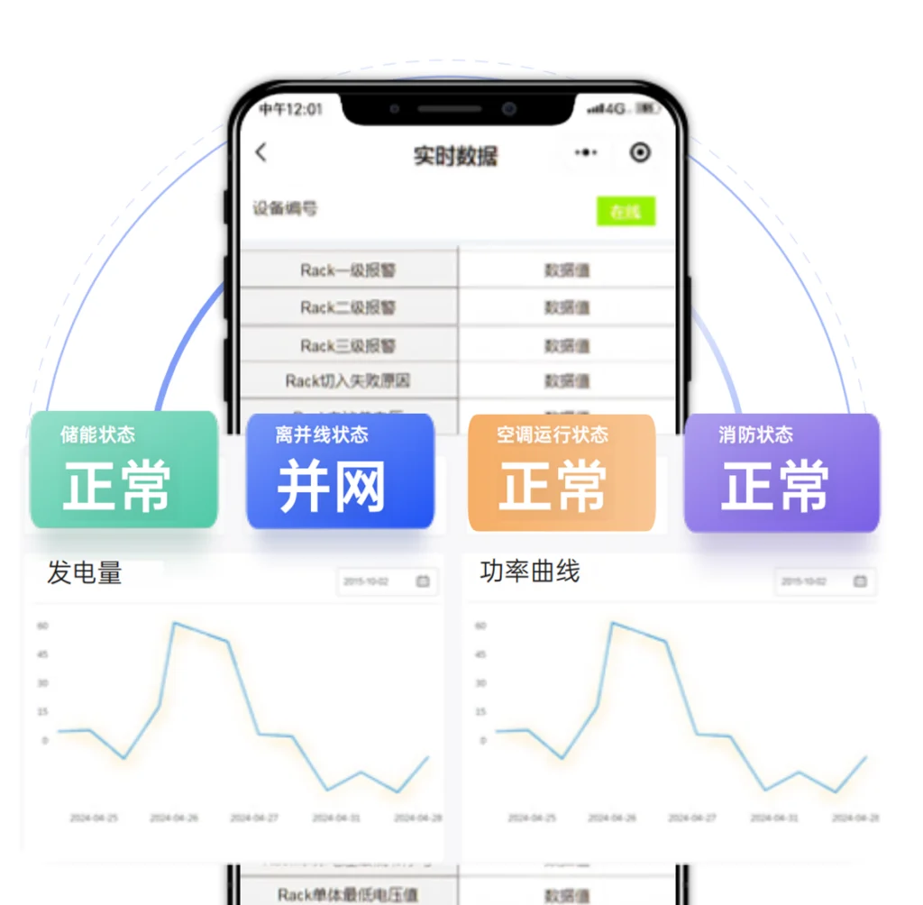 Provides 24/7 real-time monitoring of energy storage battery data, including power, current, load curves, and key parameters such as SOC and SOH, with intelligent balancing and protection enabled by the BMS system.