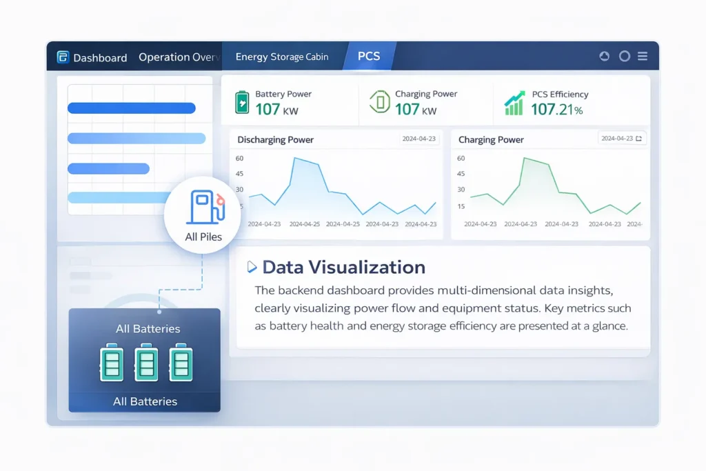 The backend dashboard provides multi-dimensional data insights, clearly visualizing power flow and equipment status. Key metrics such as battery health and energy storage efficiency are presented at a glance.