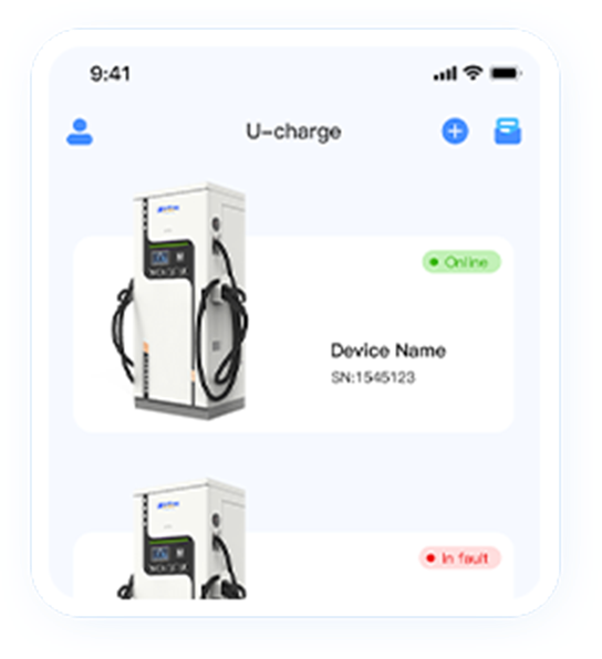 Displays charger name/ID, online status, real-time power, fault alerts, and charging status.